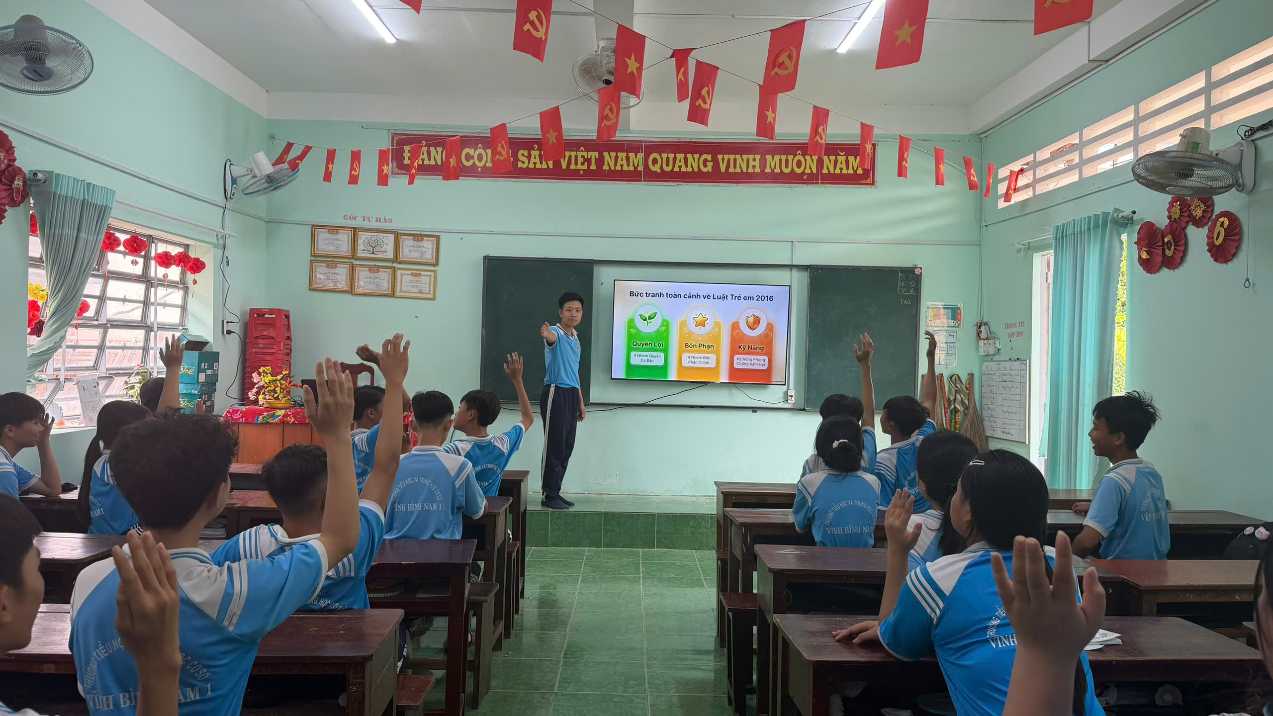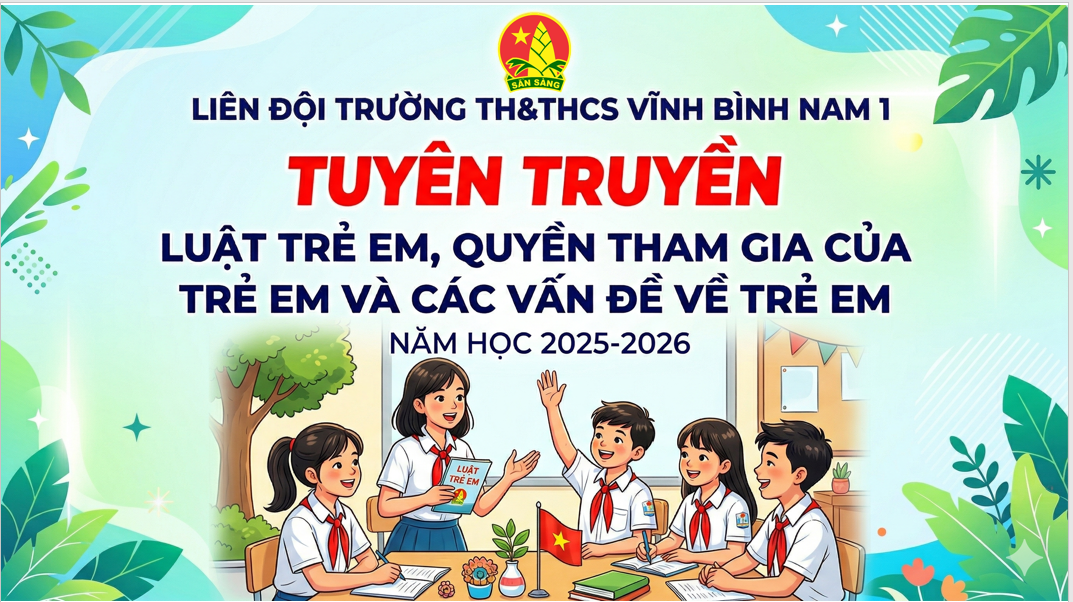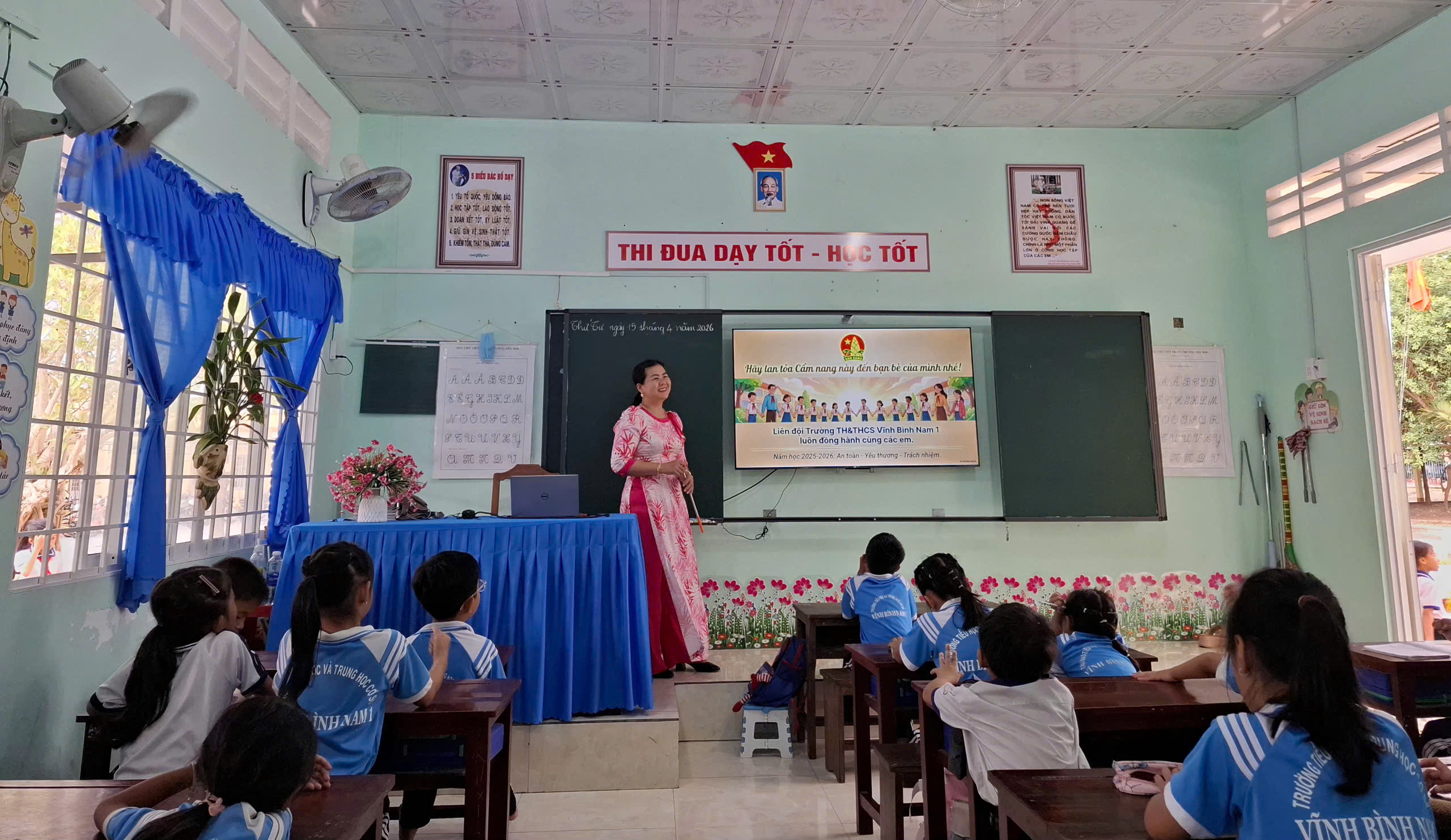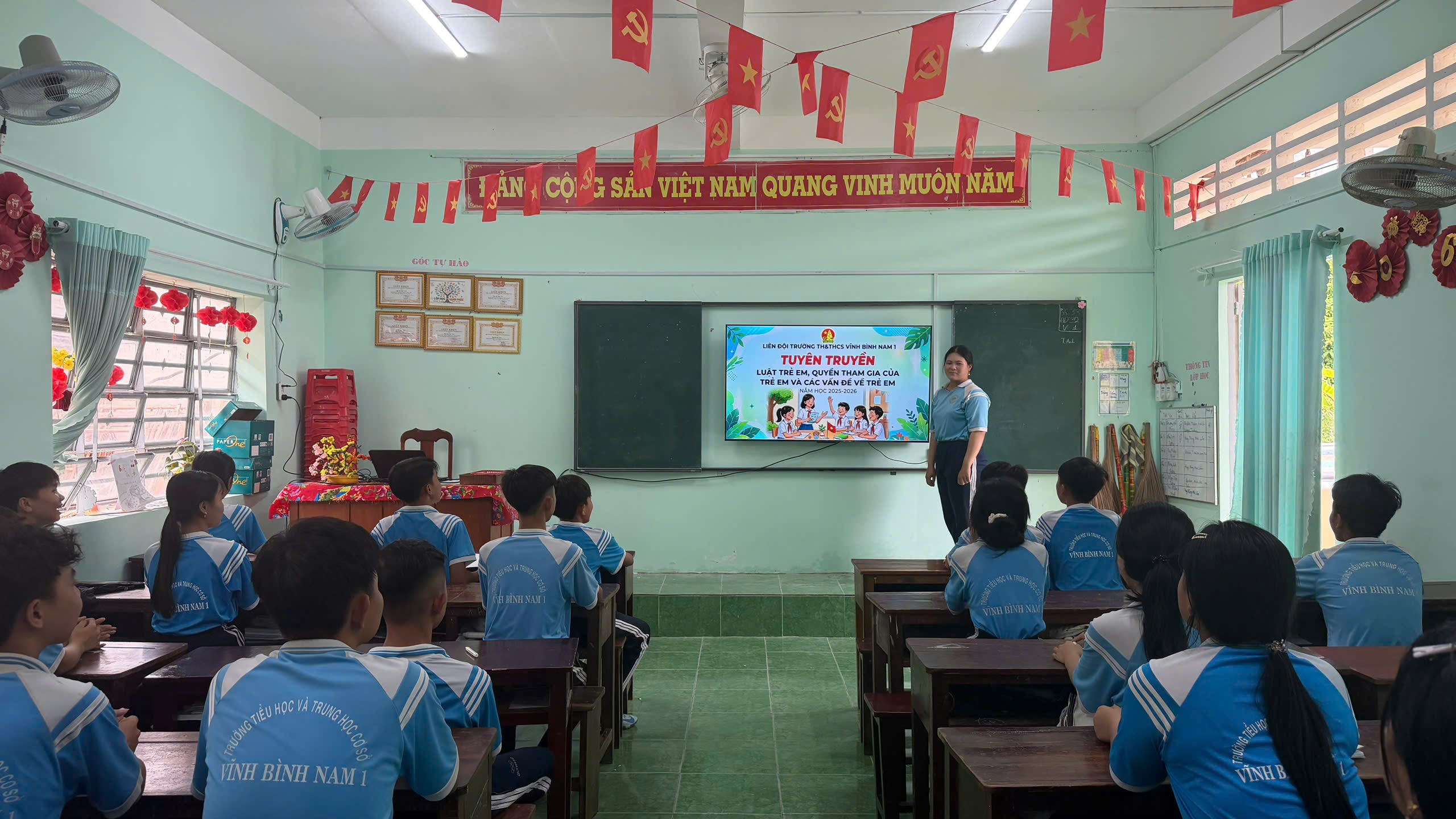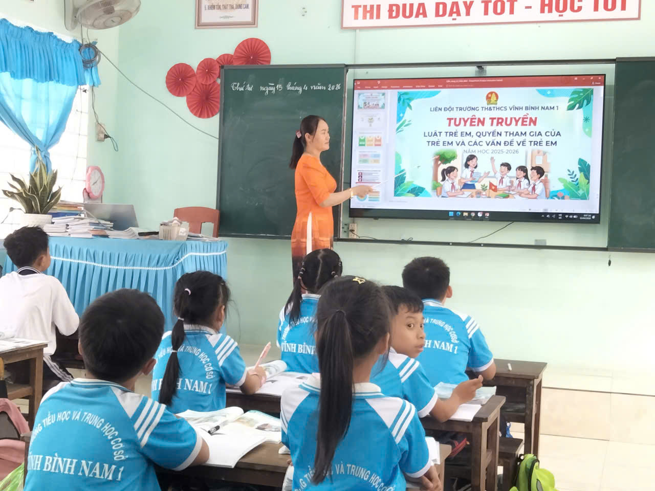 Nhằm trang bị cho học sinh những kiến thức nền tảng về quyền và bổn phận của bản thân, thời gian qua, Liên đội Trường TH&THCS Vĩnh Bình Nam 1 đã triển khai đồng bộ, sáng tạo nhiều hoạt động tuyên truyền Luật Trẻ em. Với phương châm “Mưa dầm thấm lâu”, kiến thức pháp luật đã được khéo léo lồng ghép vào từng giờ học, từng buổi sinh hoạt, tạo nên một môi trường giáo dục an toàn, thân thiện và thấu hiểu.