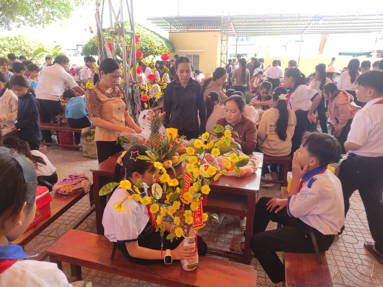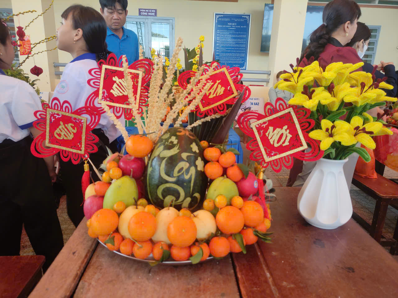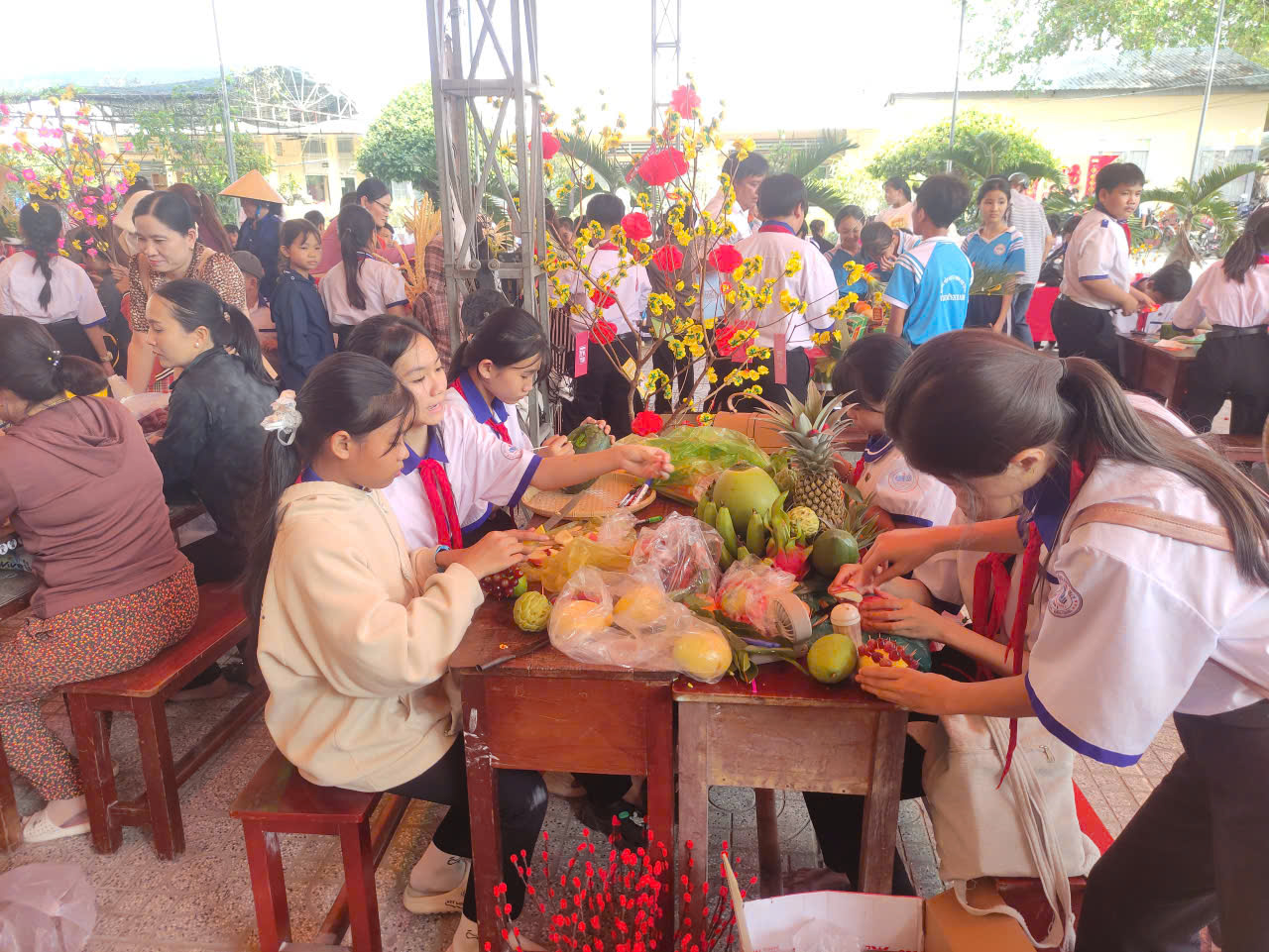 Nếu hội thi văn nghệ mang đến không khí sôi động thì hội thi “Trang trí mâm ngũ quả ngày Tết” lại là khoảng thời gian để các em học sinh thể hiện sự khéo léo, tinh tế và am hiểu về phong tục truyền thống.