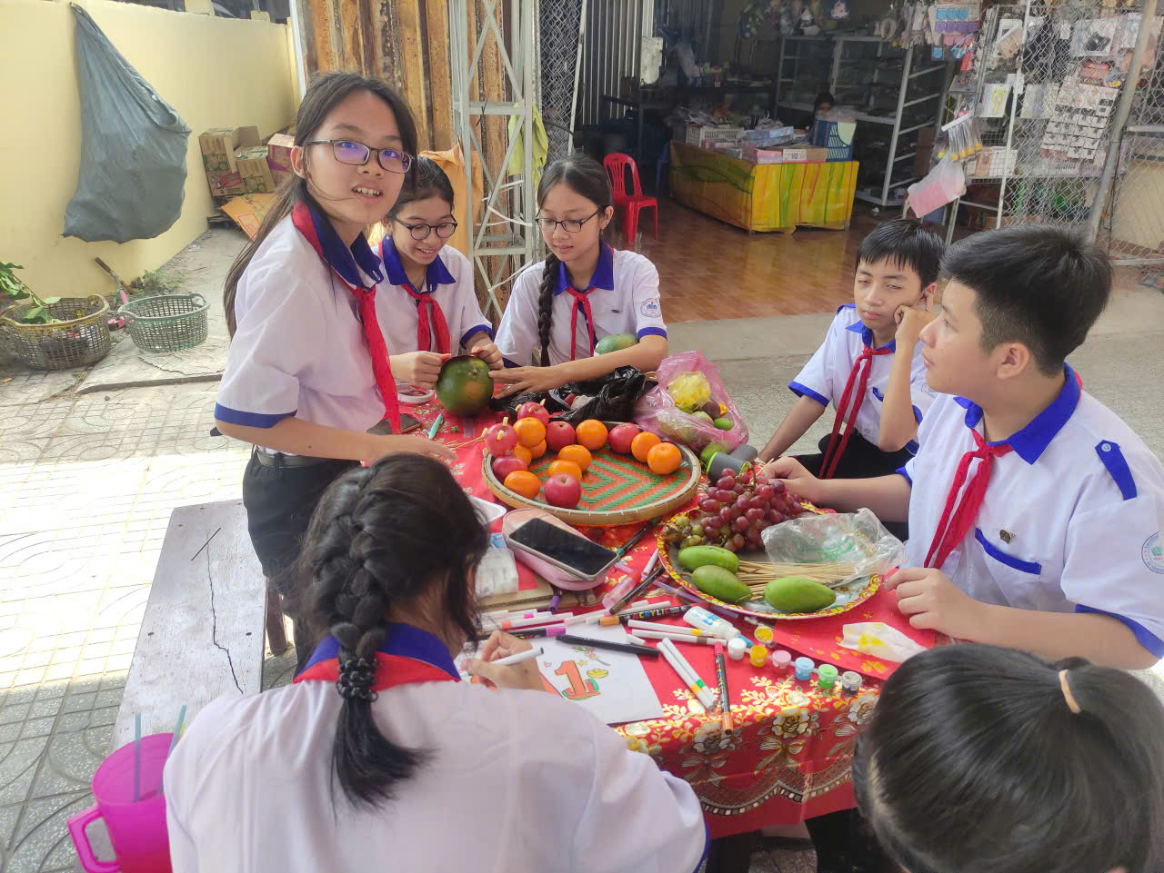 Dưới sự hướng dẫn của các thầy cô giáo viên chủ nhiệm, các chi đội và lớp nhi đồng đã cùng nhau lên ý tưởng, lựa chọn những loại quả tươi ngon, mang ý nghĩa tốt lành để kết tạo nên những mâm ngũ quả độc đáo.