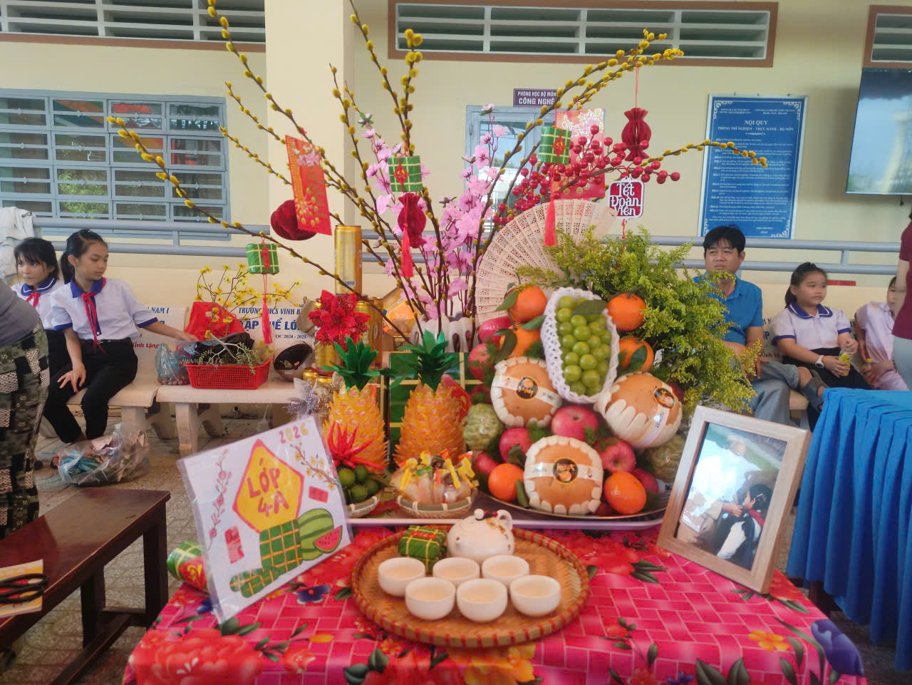 Hình ảnh các em học sinh và giáo viên đang trang trí mâm ngũ quả